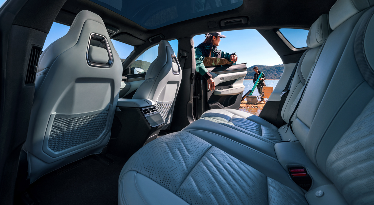 - Hàng ghế 2 của Zeekr 001 đem đến không gian rộng rãi thoải mái, khi nền tảng khung gầm xe điện SEA trứ danh cho phép tối ưu rất tốt phần sàn xe, giúp không gian để chân và khoảng không trên đầu thoáng đãng hơn khiến hành khách ngồi tận hưởng những chuyến đi thật dễ chịu.